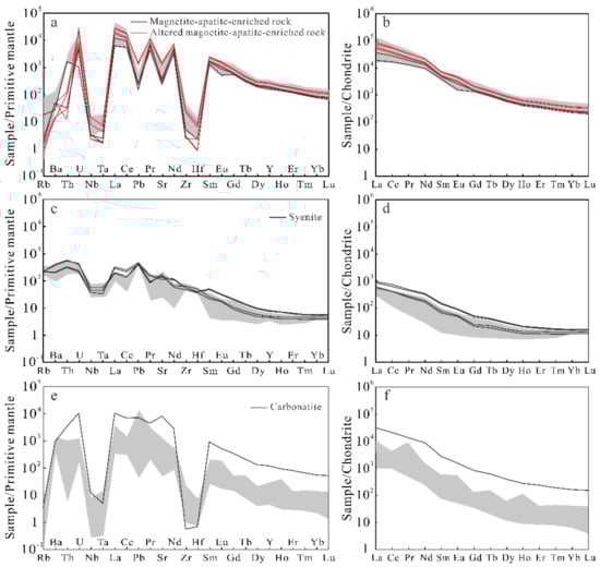 Primitive mantle normalized trace element and chondrite-normalized REE patterns of magnetite-apatite-enriched rocks (a,b), syenites (c,d), and carbonatites (e,f) from the Mushgai Khudag complex. Normalization values were adopted from McDonough and Sun [39] and Sun and McDonough [40], respectively. Reported data for these rocks are presented as grey shades for comparison [6,10,13].