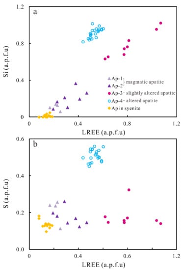 All apatite from Mushgai Khudag corresponds to fluorapatite with F contents of 2.73 to 3.77 wt.%. Apatite from magnetite-apatite-enriched rocks is characterized by high contents of SiO2, SO3, and LREE2O3 (0.36–5.59 wt.%, 0.86–4.17 wt.%, and 2.62–9.22 wt.%, respectively) compared to those within the typical magnetite-apatite-enriched rocks (SiO2 < 0.92 wt.%, SO3 < 2.93 wt.%, and LREE2O3 < 0.59 wt.%) [25]. Altered apatite shows higher contents of SiO2 (up to 5.59 wt.%), SO3 (up to 4.17 wt.%), and LREE2O3 (up to 9.22 wt.%) than magmatic apatite (0.94 wt.%, 1.40 wt.% and 4.39 wt.% on average, respectively; Figure 7). Slightly altered apatite also contains higher concentrations of SiO2 and LREE2O3 but shows a comparable SO3 concentration compared with magmatic apatite (Figure 7). An increased LREE content in apatite correlates with an increased Si abundance, which suggests a coupled substitution scheme of Si4+ + REE3+ = P5+ + Ca2+ (Figure 7a) [26]. The LREE and Si contents of slightly altered apatite (Ap-3) have the same substitution trend as magmatic apatite (Ap-1 and Ap-2) (Figure 7a). Of note, altered apatite (Ap-4) also displays correlated increases in S and LREE contents (Figure 7b). This suggests that the S6+ + REE3+ = P5+ + 2Ca2+ substitution scheme also contributes to REE incorporation into the apatite structure of Ap-4 in addition to the coupled Si substitution scheme [26].