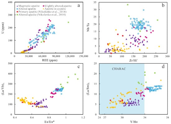 Diagrams displaying trace-element variations of apatite within magnetite-apatite-enriched rocks and syenites from Mushgai Khudag. (a) ΣREE versus U; (b) Zr/Hf versus Nb/Ta; (c) Eu/Eu* versus La/YbN; (d) Y/Ho versus La/SmN. The CHArge-and-RAdius-Controlled (CHARAC) interval of Y/Ho ratios in (d) was taken from Bau [45].