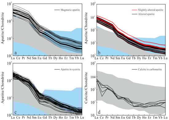 Chondrite-normalized REE patterns of apatite from magnetite-apatite-enriched rocks and syenites (a–c) and calcite from carbonatite (d). Normalization values were adopted from Sun and McDonough [40]. Previously reported apatite data from magnetite-apatite-enriched rocks and carbonatite are presented in blue and gray in (a–c) for comparison [25,27,34,43,44], and calcite data from carbonatite are presented in gray in (d) for comparison [27,34,46,47,48,49].