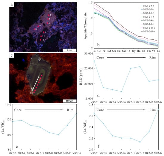 Apatite from magnetite-apatite-enriched rocks and syenites displaying trace-element variations. (a,b) Dark purple luminescent apatite grains characterized by higher REE contents than the light purple luminescent ones; (c–f) trace element composition variation trends recording the oscillatory zonation of apatite within syenite. The red dots and the accompanying number (a,c) refer to the analytical points of samples. 4–11 in (a) refer to MK3-2-4 to MK3-2-11 in (b); 7, 14 in (c) refer to MK7-7 and MK7-14 in (d–f).