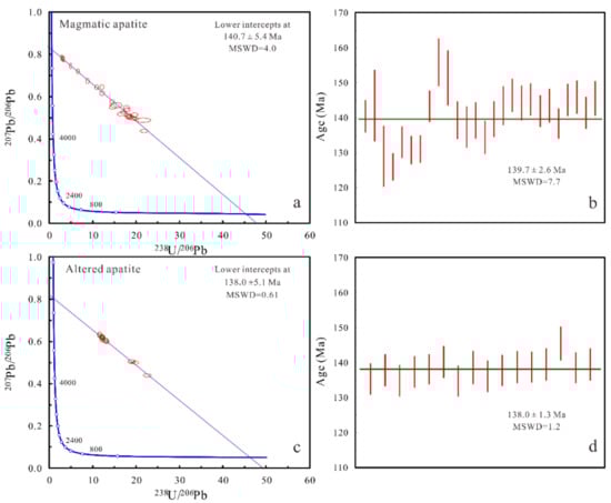 Trace element data suggest that both magmatic and altered apatite are characterized by a high U content ranging from 17.4 to 512 ppm, which favors high-quality U–Pb dating (Table S3). U–Pb geochronological data for magmatic apatite (Ap-1 and Ap-2) and altered apatite (Ap-4) from magnetite-apatite-enriched rocks are listed in Table S4 and shown in Figure 11. Both magmatic and altered apatite were dated in situ by LA-ICP-MS and similar U-Pb ages of 140.7 ± 5.4 and 138.0 ± 5.1 Ma were found, as shown in the Tera–Wasserburg plots (Figure 11a,b). The y-intercept corresponds to a 207Pb/206Pb ratio that represents the best estimate for the composition of the common Pb component. The common Pb corrected weighted mean 206Pb/238U ages are 139.7 ± 2.6 and 138.0 ± 1.3 Ma, respectively (Figure 11c,d), which is consistent with the Rb–Sr age in the associated syenite (139.9 ± 5.9 Ma) [6].