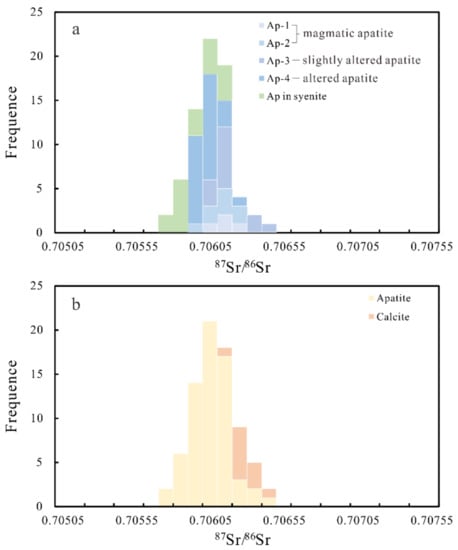 In-situ Sr isotopic compositions of apatite from magnetite-apatite-enriched rock and syenite (a) and calcite from carbonatite (b).