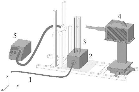 The experimental apparatus [40] consists of five main parts as seen in Figure 1. Pressurized air comes from an air compressor (1) to a filling tank underneath the bubble generator (2), which creates a bubble at the top of a thin capillary of an inner diameter 10 µm in the glass cell (3) with dimensions of 30 cm height, 8 cm width, and 6 cm depth. The size of the bubble is controlled by the gas flow rate and the growth time of the bubble. The bubble of desired size is released from the capillary by its quick pulldown. After the release, the bubble motion is captured 20 cm above the bottom of the cell, where the bubble velocity is considered steady. A Photron SA1.1 high-speed camera (4) with a 1024 × 1024 pixel resolution, 2–3 px/μm image resolution, and Navitar macro-objective lens was used to capture images of the rising bubble with a frame rate 1000 or 2000 fps. A cold light source (5) was used for area illumination.