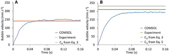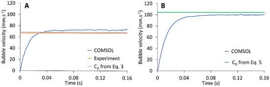 In Figure 2, the time-dependent velocities of bubbles with diameters 0.6 and 0.8 mm rising in propanol are outlined. For the 0.6 mm bubble (Figure 2A), the experimental value of terminal velocity was 67 mm·s−1. The simulation result (73 mm·s−1) agrees with the experimental data, where the difference was 9%. The theoretical velocity calculated using Equations (1) and (3) was 68 mm·s−1. The agreement of the results is very good. The shape of the 0.6 mm bubble rising in propanol was compared to the experimental bubble aspect ratio and, concurrently, to the theoretical aspect ratio, which was estimated using the Moore correlation (Equation (4)). The deformation calculated by COMSOL (χ = 1.023) agrees with the experimental observation (χ = 1.013) and with the estimated value (χ = 1.018). Such a conclusion is also satisfactory for using the expressions for spherical bubbles when calculating the drag coefficient. Experimental data were not available for the 0.8 mm diameter bubble. Figure 2B, therefore, shows a comparison of the simulation only with the theoretical velocity. The drag coefficients calculated both using the Mei relation for spherical bubbles (Equation (3)) and Moore equation for deformed bubbles (Equation (5)) were identical; thus, only the value obtained from Moore relation is displayed in the graph. The velocity calculated using the above relationships was 104 mm·s−1. The velocity value from the simulation was 100 mm·s−1 and the difference was, thus, 4%. The aspect ratio value obtained from COMSOL (χ = 1.060) was compared only to the theoretical value (χ = 1.043), and both values are in good agreement.