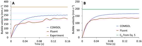 In the case of a bubble rising in water (Figure 4A), the velocity was compared to the experimental value. In both cases, the velocities from the solvers were quite underestimated. In COMSOL, the resulting steady-state velocity (250 mm·s−1) was around 27% lower than the experimental value of 341 mm·s−1 from [41]. The steady-state velocity obtained from Fluent (216 mm·s−1) was even lower; the difference from the experimental velocity was around 37%. The unsteady shape of the Fluent curve could have been caused by the bubble shape oscillation during the rise or by numerical instabilities. Figure 4B displays the velocities of bubbles rising in propanol obtained from both solvers compared to the theoretical velocity. In this case, the result from COMSOL (166 mm·s−1) was closer to its corresponding theoretical value, with the velocity being around 16% lower than that assumed by Equation (5) (197 mm·s−1). The velocity obtained in Fluent (133 mm·s−1) was around 32% lower.