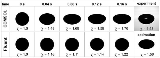 Correct description of the bubble shape is a key factor in simulating the movement of the bubble because the drag coefficient depends on the bubble aspect ratio. Therefore, the steady-state shapes of bubbles from CFD solvers were compared to theoretical and experimental results. Results for a bubble in water with Db = 1.5 mm are given in the Figure 5. The experimental aspect ratio was 1.534, whereas the estimation using Equation (4) was 1.557. The evolution of the bubble shape during the simulation is further illustrated. The simulation was terminated after 0.16 s (the equilibrium value of the aspect ratio was an average of the last 10 values), and the time step between two consecutive images was 0.04 s. During the Fluent simulation, the bubble remained almost spherical and deformed very little (χ = 1.219). As a result, the drag coefficient should be small and the bubble velocity should be high, which is not true, and the resulting velocity was lower than expected. COMSOL provided a better simulation and the bubble was sufficiently deformed during the rise. At the same time, small shape oscillations occurred. Minor oscillations were also observed during the experiments and corresponded to the limit bubble size for rectilinear motion [51]. The equilibrium aspect ratio was 1.758, which exceeded the experimental value of 1.534. A larger deformation then indicated a higher drag coefficient and a lower bubble velocity. To summarize the simulation results, an error in the aspect ratio of 15% led to an error of 27% in the velocity estimate. However, these results are very good, considering that simplistic assumptions were used, especially the assumption of 2D axisymmetry.