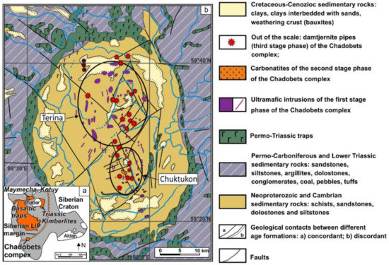 The Chadobets alkaline complex of UMLs and carbonatites is located in the southern part of the Siberian Craton (Figure 1). Tectonically, it is confined to the large positive structure of the platform that is represented by the Chadobets dome-shaped uplift. The core of the uplift forms two protrusions, the northern Terina complex and southern Chuktukon complex, and is composed of carbonate–terrigenous Precambrian and early Cambrian sediments [13,30,33,34,35,36].