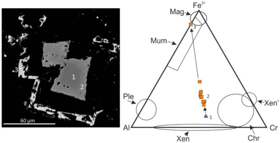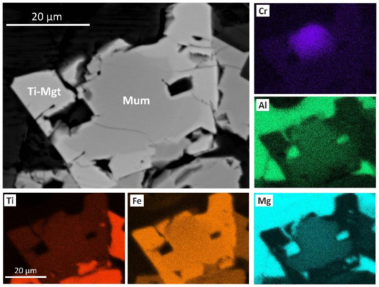 In Mum spinels surrounding Al-spinels, the rim size is 10–20 µm. The composition of Mum spinels shows an increase in Fe3+ and Ti and a decrease in Al and Cr relative to the above-described spinels (Figure 8).