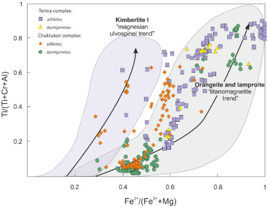 Plot of atomic ratios Ti/(Ti + Cr + Al) and Fe2+/(Fe2+ + Mg) for minerals of the spinel group [42].