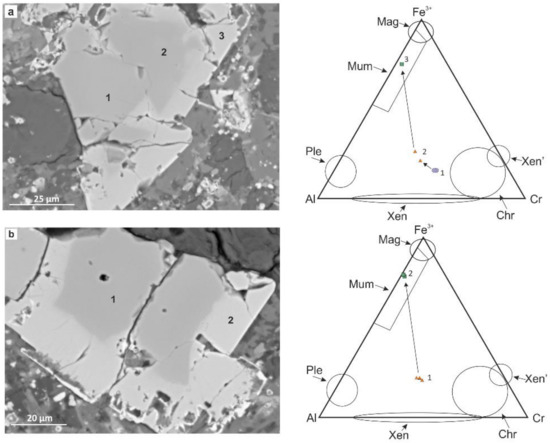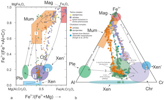 (a) Plot of Fe3+/(Fe3+ + Al + Cr) & Fe2+/(Fe2+ + Mg) and (b) diagram Al–Fe3+-Cr. Xen’spinel xenocrystals from peridotites, Xenʼ—metasomatized spinel xenocrystal from peridotites, Chl—chromite, Ple—pleonast-spinel, Mum—magnesio-ulvospinel-magnetite and magnetite (Mag). The lines show possible evolutionary trends for different genetic types of spinels [27]. Black circles are the spinels from ultramafic lamphrophyres of Greenland and Canada [43,44,45].