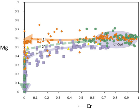 Further crystallization of high-alumina Cr-spinels leads to three similar trends (Trends 1′–3′) that show a significant decrease in the amounts of Al and Cr with a change in composition from Chr to Mum (Figure 6). This change could be the result of a combination of various factors such as the degassing of magma with the release of carbon dioxide, rapid temperature changes, and crystallization of other minerals in the groundmass.