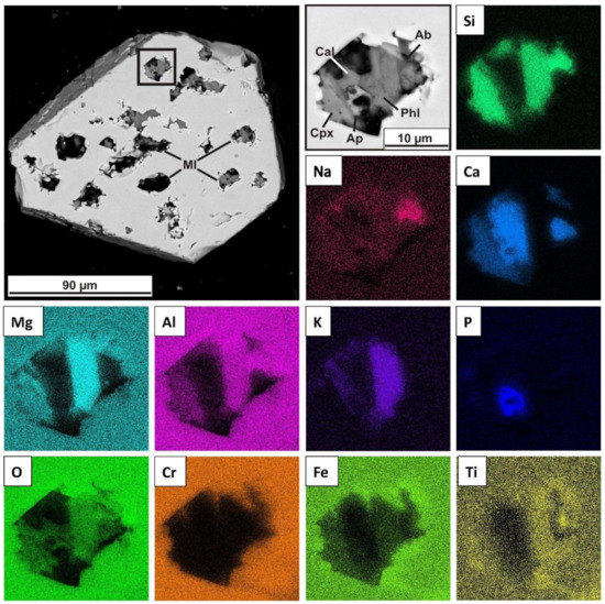 Melt inclusions (MI) in the Cr-spinel of the damtjernites of the Chuktukon complex, BSE images and electron microprobe (EMP) X-ray element maps. Ab—albite, Ap—apatite, Cal—calcite, Cpx—clinopyroxene, Phl—phlogopite.