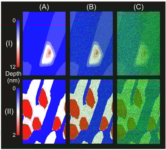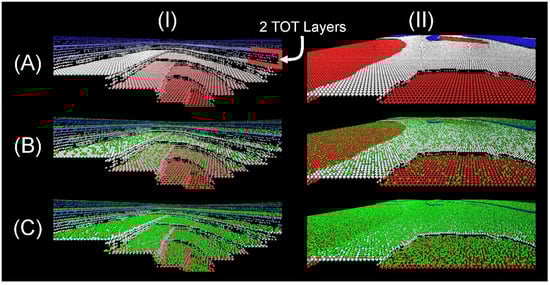 Perspective view of (I) the deepest part of the single etch pit and (II) the three top left etch pits. The view direction is parallel to the lateral boundaries of the system as can be seen in Figure 2. Row (A) shows both surfaces before adsorption with an indication on the step height of up to two TOT layers in case (I), while in case (II), the two steps are one TOT layer each. The same color scale as in Figure 2 is used to represent the pit depth. Images in rows (B) and (C) show the distribution of adsorbed radionuclides (green) after 75.000 and 300.000 atoms identical to the time steps shown in Figure 2.