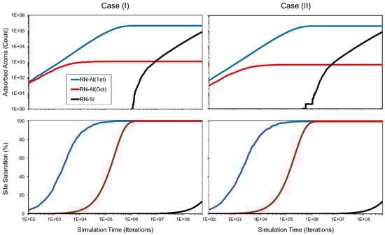 Coordination of the adsorbed atoms for both cases (I) and (II) with proceeding simulation. Both cases produce a similar distribution of adsorption sites. Case (II) has only about 60% of the octahedral sites found in case (I). The times for reaching full site saturation for aluminum sites are roughly the same in both cases, and adsorption to silicon starts at full saturation of both other sites. By looking at the site saturation, it is observable that both aluminum sites become fully saturated during the simulation.