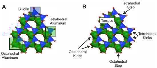 Surface sites on the muscovite (001) basal plane. (A) The current variability of adsorption sites differentiating between the available cations and their oxygen coordination resulting in three different possibilities. Exemplary sites are highlighted, but no difference exists to non-highlighted surface atoms regarding the adsorption affinity. (B) Surface sites characterized by their coordination environment. Considering the coordination results in higher complexity of possible adsorption sites. Note that for a precise description of kink and step positions, more information on coordination beyond the size of this sketch is required and that no terrace positions for the octahedral layer occur in muscovite. Another level of complexity can be added when considering step orientation and upper/lower layer differences. For a more detailed depiction of muscovite surface sites see Figure 10 in [5].
