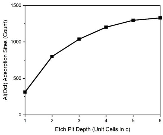 Despite the incomplete adsorption parameterization, the model can show the surface sites that are available as bonding partners on the muscovite surface. The KMC model can show how the change in nanotopography affects the availability of these specific adsorption sites and the changes with proceeding surface dissolution. As we identified, the octahedral aluminum surface sites appear to play an important role in radionuclide adsorption on sheet silicates. Such sites are not available on atomically flat muscovite or similar sheet silicate (001) surfaces. Octahedral aluminum becomes exposed to the surface and is available for adsorption reactions after steps and pits developed on the (001) surface. Figure 6 shows the availability of octahedral aluminum sites for adsorption depending on the etch pit depth. An increase in etch pit depth leads to an increase of exposed octahedral sites. At higher pit depths, the number of octahedral sites seems to become constant. This effect highlights the importance of surface nanotopography on the availability of surface sites and the efficiency to adsorb species from solution. Such an analysis can be performed for any surface site depending on atom type, crystal structure, and coordination.