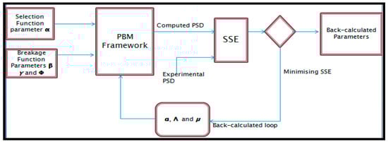 The use of population balance modelling to understand breakage in the impact crusher entailed using raw data collected from the experiments to determine the breakage function parameters (β, γ and Φ from Equation (2) and the selection function parameters (a, α, Λ, and µ). For breakage function parameters, Austin et al. [17] posit that good results are obtained when the grinding time is chosen at the point when 20–30% of the material has been broken out of the top size. These researchers also postulated that large amounts of test work is needed to measure all the parameters; thus, they proposed to back-calculate some of the parameters within the population balance model framework. To that end, the experimentally measured breakage function (β, γ, and Φ) and selection function parameters (α and a) were input parameters to a search algorithm generated to search for the best combination of all parameters that successfully minimised the sum of squared errors between the experimental and predicted product size distributions. Figure 2 presents the flowchart for the parameter back-calculation procedure. The calculation procedure is executed through a parameter fmincon that uses a sequential quadratic programming (SQP) method. The function solves a quadratric programming (QP) sub-problem at each iteration. An estimate of the symmetric matrix of the objective function is updated at each iteration by globally converging all the unknown parameters simultaneously and not adjusting them one at a time. The selection and breakage function parameters determined from the algorithm (β, γ, Φ, a, α, Λ, and µ) were then used to assess the performance of the crusher for longer operation times.