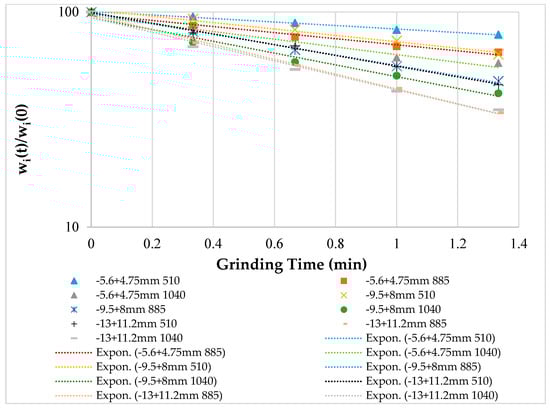 Figure 3 shows the plots of the specific rate of breakage vs. time, and it can be seen that different size classes displayed first-order behaviour. The selection function values (Si) are determined from the slopes of the plots using the power function.