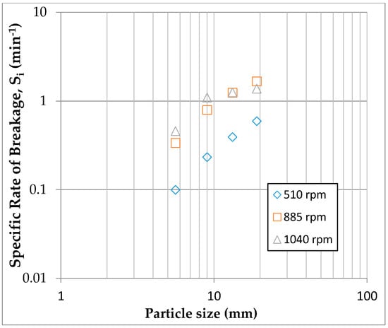The Si values obtained from the first-order plots in Figure 3, were plotted against feed sizes, and the plots are presented in Figure 4. This helps to graphically present the influence of the crusher rotor speed on the breakage rates of different particle sizes. As seen in the figure, the curves of the rotor speeds, 510 rpm and 885 rpm, are all still within the normal breakage region and thus were used to determine the selection function parameters a and α using the power function. The a and α values for rotor speed 510 rpm were found to be 0.0086 and 1.46, and those for 885 rpm were 0.039 and 1.31 respectively. It is interesting to note that operating the crusher at the rotor speed of 1040 rpm is not beneficial for larger particles as witnessed by the drop of the breakage rates for particle sizes in the ranges of -13 +11.2 mm and -19 +16.7 mm.