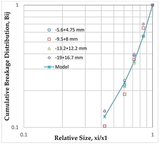 Figure 5 presents the primary breakage distribution plots of all initial feed size classes determined using Equation (4) and characteristically, the plots show that the breakage distribution function does not depend on the feed particle size, i.e., the primary breakage distribution functions can be considered normalizable. Thus, the B values were fitted into the empirical model presented in Equation (2) and the breakage function parameters β, γ and were determined to be 5.39, 2.38, and 0.38 respectively. The value of γ is a bit high, which implies that the daughter fragments are coarser. This is understandable considering that the reduction ratios were very low for this crusher. The lower value of . shows that particles were breaking from the parent size at a slow rate.