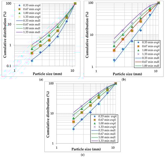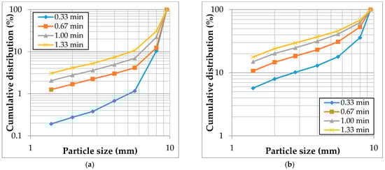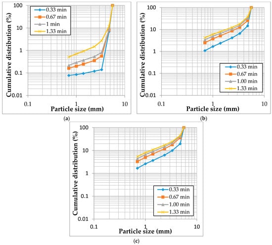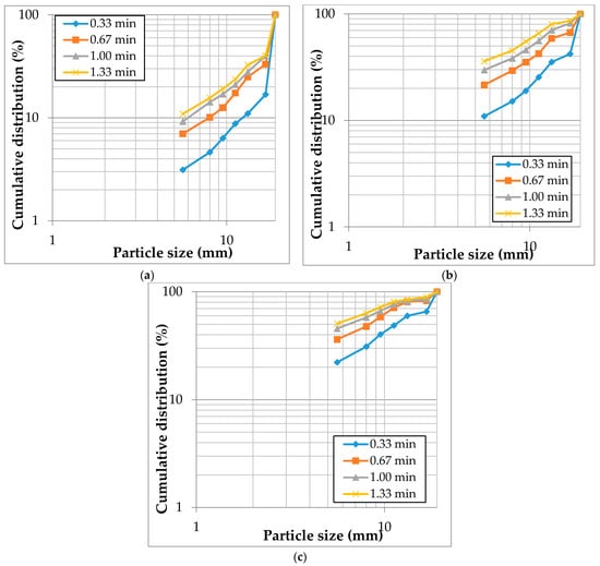 Figure 9 presents the PSDs obtained from grinding feed size -19 +16.7 mm at different rotor speeds and crushing times. The figure shows that there was a difference of 14% between the PSDs of the 0.33 and 0.67 min crushing times for the lowest rotor speed, and then it decreased to 6% between the PSDs of 1 min and 1.33 min. For the 885 rpm and 1040 rpm rotor speeds depicted by Figure 9b,c respectively, crushing the material beyond the 0.67 min is not beneficial owing to less than 5% difference in the cumulative distribution of 1 and 1.3 min.