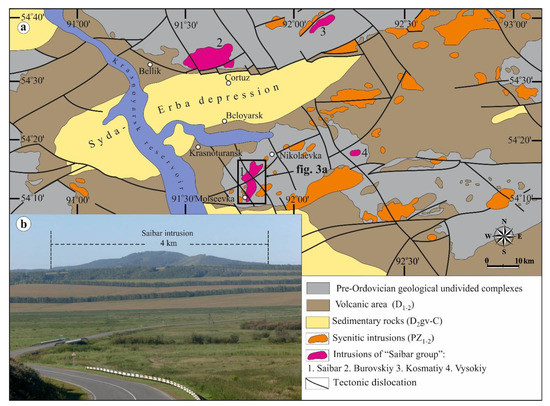 - Kosorukov, A.P. Devonian alkaline-syenite complex of the Sydo-Erbinsk depression and its mountain frame. In Magmatic Complexes of Folded Regions of Southern Siberia; Polyakov, G.V., Ed.; Nauka: Novosibirsk, Russia, 1981; Volume 509, pp. 128–157. (In Russian) [Google Scholar]
