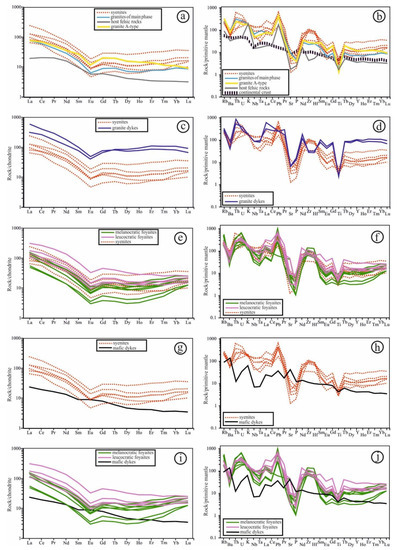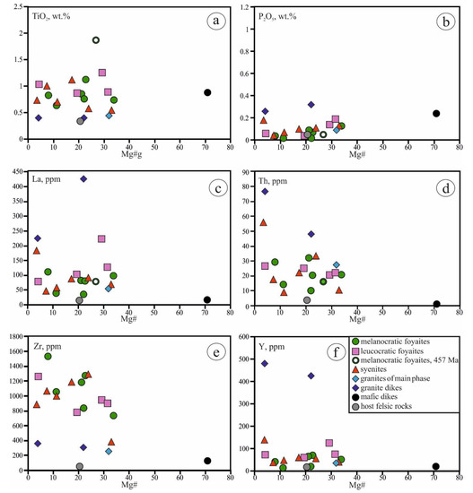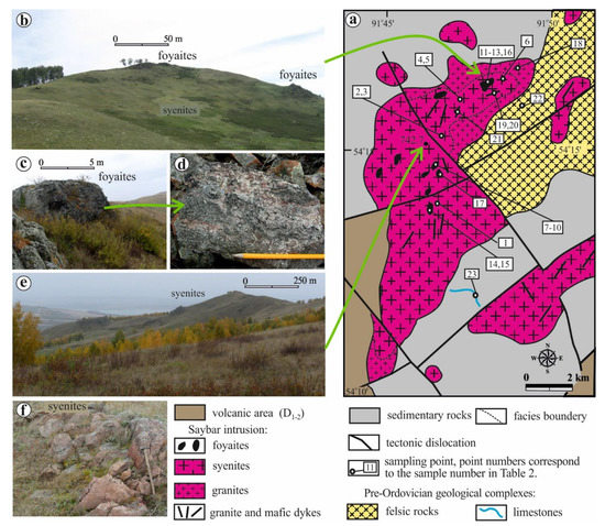 - Vrublevskii, V.V.; Gertner, I.F.; Gutiérrez-Alonso, G.; Hofmann, M.; Grinev, O.M.; Mustafaev, A. Multiple intrusion stages and mantle sources of the Paleozoic Kuznetsk Alatau alkaline province, Southern Siberia: Geochemistry and Permian U–Pb, Sm–Nd ages in the Goryachegorsk ijolite-foyaite intrusion. Int. Geol. Rev. 2020, 1–17. [Google Scholar] [CrossRef]