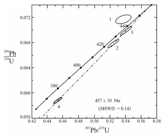 - Ludwig, K.R. PBDAT—A Computer Program for Processing Pb-U-Th Isotope Data, Version 1.22. In Open-File Report; United States Geological Survey: Reston, CF, USA, 1991; Volume 38, pp. 88–542. [Google Scholar]