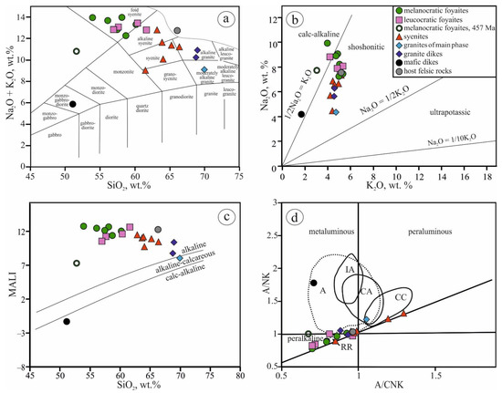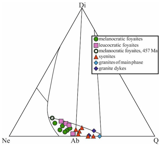 - Andreeva, E.D.; Kononova, V.A.; Sveshnikova, E.V.; Yashina, R.M. Alkaline rocks. In Igneous Rocks; Bogatikov, O.A., Kononova, V.A., Borsuk, A.M., Gon’shakova, V.I., Kovalenko, V.I., Laz’ko, E.E., Sharkov, E.V., Eds.; Nauka: Moscow, Russia, 1984; Volume 2, pp. 1–415. (In Russian) [Google Scholar]