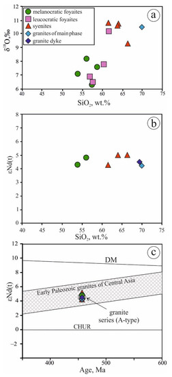 Vorontsov, A.A.; Izoh, A.E.; Yarmolyuk, V.V.; Komaritsyna, T.Y.; Nikiforov, A.V.; Perfilova, O.Y.; Dril, S.I.; Rizvanova, N.G.; Dushkin, E.P. Evolution of Syenite Magmas: Insights from the Geology, Geochemistry and O-Nd Isotopic Characteristics of the Ordovician Saibar Intrusion, Altai-Sayan Area, Russia. Minerals 2021, 11, 473. https://doi.org/10.3390/min11050473