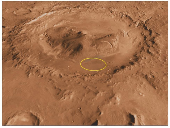 Image showing Gale crater (~154 km diameter) and the landing ellipse in yellow. The image was created using combined data from the Thermal Emission Imaging System camera on the Mars Odyssey orbiter, the Mars Orbiter Laser Altimeter on the Mars Global Surveyor orbiter, and the High-Resolution Imaging Science Experiment camera on the Mars Reconnaissance Orbiter. Image credit: NASA/JPL-Caltech/ASU/UA.
