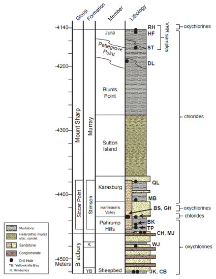- Schwenzer, S.P.; Bridges, J.C.; Wiens, R.C.; Conrad, P.G.; Kelley, S.P.; Leveille, R.; Mangold, N.; Martin-Torres, J.; McAdam, A.; Newsom, H.; et al. Fluids during diagenesis and sulfate vein formation in sediments at Gale crater, Mars. Meteorit Planet. Sci. 2016, 51, 2175–2202. [Google Scholar] [CrossRef]