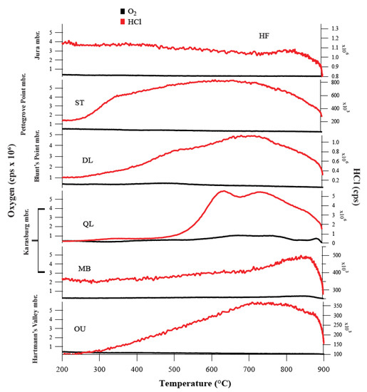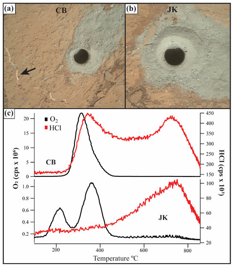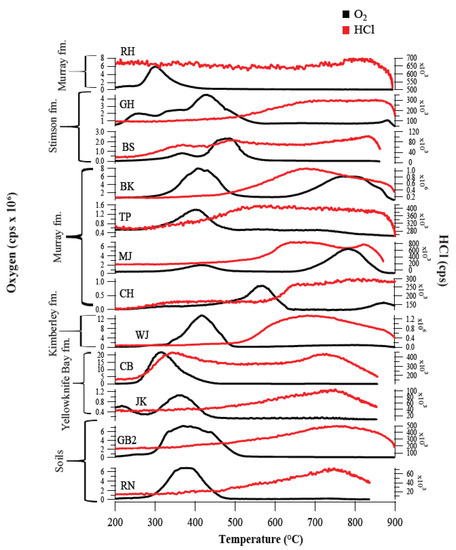 Evolved oxygen, HCl, and chlorohydrocarbons, indicative of oxychlorines, were detected in subsequently analyzed samples in a variety of depositional environments (e.g., lacustrine, aeolian) recorded in the Yellowknife Bay, Stimson, Kimberley, and Murray formations observed over an elevation change of ~380 m (Figure 2 and Figure 3) [26,28,29]. O2 release peak temperatures attributed to oxychlorines ranged from ~250 to 600 °C [26] (Figure 4; Table 1). Oxychlorine concentrations were as high as 1.05 wt.% in the Yellowknife Bay formation, but some of the Vera Rubin Ridge (VRR) samples produced no evidence of oxychlorines, possibly due to leaching of soluble salts [28,29,30]. Samples that did not evolve O2 but did evolve HCl (Oudam, Marimba, Quela, Duluth, Stoer, Highfield) may contain chlorides [29,30]. The presence of multiple O2 peaks in some samples such as Big Sky and Greenhorn suggested that multiple cation phases of perchlorates and/or chlorates were present (Figure 4) [26,31].