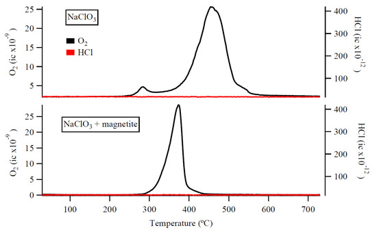 Iron-bearing phases decreased the O2 release peak temperature of chlorates by up to ~215 °C, and the temperature reduction depended on the type of iron-bearing-phase in the mixture and the iron-bearing-phase/chlorate ratio [31]. Mixtures of K chlorate with magnetite, hematite, palagonite, and ferrihydrite caused an O2 release peak reduction of 112–142 °C [31]. Mixtures of Na and Mg chlorate with the same iron-bearing phases caused an O2 release peak reduction of 72–214 and 35–149 °C, respectively [31] (Figure 5). The only mixtures that produced HCl releases were those with Mg chlorate. The HCl release peaks from Mg chlorate decreased by 33–170 °C when mixed with iron-bearing phases [31]. Similar to Sutter et al. [52], ferrihydrite and palagonite caused the greatest depression in O2 release peak temperature out of all the chlorate/iron-bearing phase mixtures, and this was attributed to their high surface areas [67]. Additionally, the chlorate mixtures with the higher iron-bearing phase/chlorate ratios caused a greater reduction in O2 release peak temperature than mixtures with lower iron-bearing phase/chlorate ratios. This was attributed to the differences in total iron available to catalyze the chlorate decomposition [31].