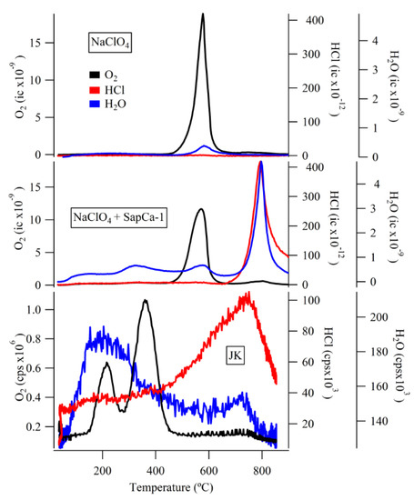 Example showing the effect of water-evolving phases on HCl evolutions from mono-cation perchlorates. This example shows evolved O2, HCl, and H2O from 24 µmol NaClO4 by itself and mixed with 20 mg SapCa-1 saponite, compared to John Klein (JK) analyzed by SAM. Data from [29]. ic = ion current (Amperes).