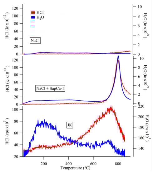 Na chloride by itself did not evolve HCl as expected but it did evolve HCl when mixed with the water-producing phases. Mixtures of NaCl with saponite and the basaltic glass both produced HCl releases with peaks at ~800 °C that co-occurred with water releases (e.g., Figure 8). The nontronite/NaCl mixture evolved two HCl release peaks, one at the same temperature as nontronite dehydroxylation and another at the melting point of NaCl [29]. HCl releases in the NaCl mixtures were attributed to solid or melting chlorides reacting with water from inclusions or from phyllosilicate dehydroxylation [29].