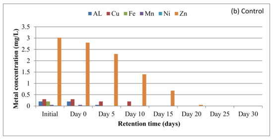 Figure 3a reveals that the metal concentration significantly decreased during the 30 days of retention time but with different removal efficiency for each metal. For instance, iron decreased slowly for the first 10 days and then drastically until the end of the experiment, whereas others metals decreased slowly from the beginning until the end (Figure 3a). The metal concentration reduction can be attributed to sedimentation and accumulation by Vetiveria zizanioides. In the meantime, the concentrations of metals in the control wetland decreased and were below the detection limit of 0.0001 mg/L at the end of the experiment for all metals (Figure 3b). This can be explained by the sedimentation and accumulation by Vetiveria zizanioides. In fact, a metal such as Fe plays a crucial role in plant metabolism processes such as DNA synthesis, respiration, and photosynthesis, and its deficiency in plants leads to common nutritional disorders [63]. Metals such as Cu, Fe, Zn, and Mn act as important co-factors for many enzymes and are essential for both mitochondrial and chloroplast functions [64]. Furthermore, zinc is one of the eight essential micronutrients. It is needed by plants in small amounts, and is crucial to plant development as it plays an important role in a wide range of processes, such as growth hormone synthesis [65]. Many processes in plant metabolism, such as chloroplast formation, photosynthesis, nitrogen uptake, and synthesis of some enzymes, are directly linked to the presence of Mn in plant [66]. In addition, the sorption of metals in oxide form is widely known, as reported by Stumm and Morgan [67]. The oxide form plays an important role in metal removal in constructed wetland if Fe/Mn oxides are present.