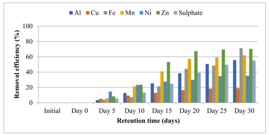 The removal efficiency is the percentage of a molecule of a given compound removed or destroyed during the treatment process (Figure 5). It was calculated gradually for each metal of concern and SO42− for the duration of experiments. The results showed that the metal removal percentage is ranked in the order: Fe (71.25%) > Zn (70.40%) > Al (68.93%) > Mn (62%) > SO42+ (55.18%) > Ni (35%) > Cu (18.83%). (Figure 5). These results were in line with the studies of Roongtanakiat et al. [72] for Fe and Mn, who used vertical subsurface constructed wetland. Two processes (Sedimentation and plants uptake) contribute to heavy metal removal in SSVF-CW [58]. Plants accumulate metals for their metabolism, and this may be the reason why metals such as iron are easily accumulated by Vetiveria zizanioides. Fe is the third most limiting nutrient for plant growth and metabolism, primarily due to the low solubility of the oxidized ferric form in aerobic environments [73]. In that regards, Fe deficiency results in common nutritional disorder in plants, leading to poor yields and reduced nutritional quality. The SO42− removal may also be attributed to the reduction of sulfur (S) in water, since S is an important nutrient for optimal plant growth. It is one of the key macro elements essential for plant growth and it is taken up from the soil/water by the plant in sulfate form (SO42+). S is a component of methionine, cystine, and cysteine, which are three of the 21 amino acids that are the essential building block of proteins; see Brosnan and Brosnan [74] and Colovic et al. [75].