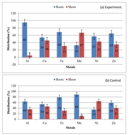 The Al3+ released to the medium enters into the root tip cell and delays the growth of the plant [88]. There was a greater translocation of Fe by Vetiver grown from both wetlands: 69% and 79% for AMD and control, respectively. The higher translocation of Mn and Zn in both wetlands may be attributed to the need of the aforementioned metals for plant metabolism, since Mn and Zn are essential nutrients [87]. A number of factors, including types of metals, plant species, types of substrate, and the initial concentration of metals, anatomical, biochemical, and physiological factors influence the metals’ translocation from roots to shoots [89]. In fact, metals are taken up from the soil by roots and transported via the plasma membrane driven by ATP-depended proton pumps that catalyze H+ extrusion across the membrane. Furthermore, along with cationic nutrients, plant transporters are also involved in shuttling potentially toxic cations across plant membranes [85]. Cytogenetic make-up and others unknown factors can be attributed to different patterns of metal translocations from roots to shoots [90].