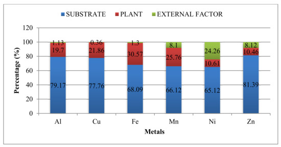 The contribution of substrate, Vetiver, and external factors in the removal efficiency of metals was determined and the results are shown in Figure 7.