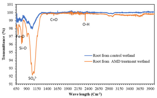 Functional groups of grinded grass roots were determined using a PerkinElmer Spectrum 100 Fourier Transform Infrared Spectrometer (FTIR) equipped with a PerkinElmer Precisely Universal Attenuated Total Reflectance (ATR) sampling accessory equipped with a diamond crystal, while morphological properties and spot analysis of grass roots and was determined using SEM-EDS. Grinded roots samples were mounted on carbon tape that was attached to Al ends. Samples were viewed in a JEOL 5400 LV SEM with an attached KEVEX electron detector (JEOL, Tokyo, Japan). They were viewed in low vacuum mode and the metals were detected with a Sigma EDS spectrometer.