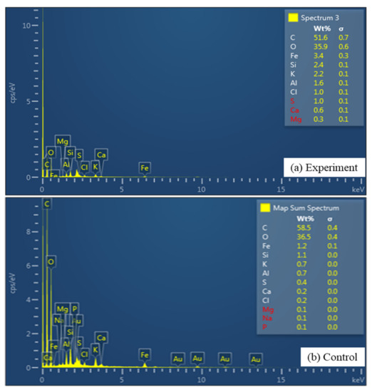 The substrate’s contribution (Ms) to overall metal removal was also determined; it is the difference between the final metal concentration in the substrate and the initial metal concentration in the substrate Equation (9):
