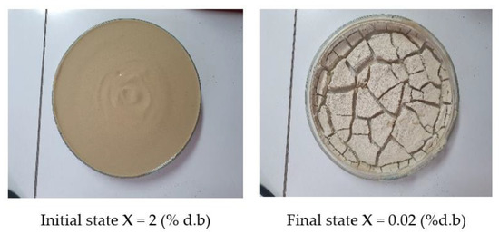 where X is the moisture content. It is defined as being the mass ratio of water content over dry matter. During the drying experiments, X is given by (Equation (11)):