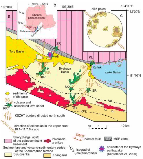 Geological map of the junction area between the lacustrine South Baikal Basin and Tunka Valley (a), location of the study area on the southern edge of the Siberian paleocontinent, bounded by the Main Sayan fault (MSF) and Primorye fault (PF) (b), and orientation of plane poles of the KSZHT dikes in the lower spherogram (c). Abbreviations: volcanoes and associated lava sheets: KR—Karerny, AN—Anchuk, ZR—Zyrkuzun, SK—Sukhoi, KL—Kultuk, MT—Meteo, and SR—Shirokiy; volcanic zones: Kamar (KM), Stanovoy (ST), and Bystraya (BS); normal faults: OF—Obruchev, SWBF—southwest boundary; isograds of metamorphism: KFS—potassic feldspar, HP—hypersthene. The geological scheme is modified after [,,]. The spherogram is adopted from []. Density of points on the spherogram: 5%, 10%, and 15%.