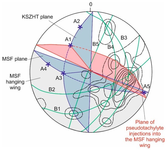 Outputs of axes of tectonic fractures in the MSF mylonites with reconstructed dips of the MSF and KSZHT planes in the lower hemisphere. Fracture belts B1, B2, B3, B4, and B5 correspond to the outlets of axes A1, A2, A3, A4, and A5, respectively. Orientations of 100 crack poles are plotted with a density of 13%, 11%…3%, and 1%. Injected bands extend along the MSF plane. Injected bands, extended along the MSF plane, correspond to the antithetical fissures of its south-southwestern hanging wing.