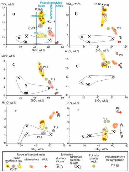 Grouping of rocks of injected melts and mylonites and their relationships with the epidote-chlorite rock from the MSF on diagrams of SiO2 plotted versus oxides: (a) TiO2, (b) FeOtot, (c) MgO, (d) Al2O3, (e) Na2O, and (f) K2O. Shown for comparisons are two types of pseudotachylyte compositions: Pt I from gneiss; Pt II from a contact between gneiss and metadolerite []. In diagrams, measured major oxide values are used.