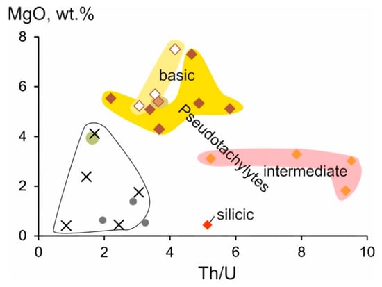 Compared with volcanic rocks (Table 2), basic pseudotachylytes have a lower MgO content. Since abundance of this oxide in a melt is functionally dependent on temperature [,,], the MSF pseudotachylyte melts had obviously lower temperatures than those of the KSZHT. On a MgO–SiO2 diagram (Figure 9a), data points of pseudotachylyte samples KL-22 and KL-9 with the highest MgO content are plotted close to volcanic rocks with the lowest content of this oxide. Consequently, temperatures of melts quenched into pseudotachylytes KL-22 and KL-9 were comparable with minimal temperatures of erupted basaltic melts. Low-Ti pseudotachylyte KL-22 shows a lower SiO2 content than moderate-Ti pseudotachylyte KL-9. Other low- and moderate-Ti pseudotachylytes show intersecting trends of increasing SiO2 and decreasing MgO abundances