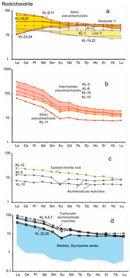 Chondrite-normalized REE spectra of rocks from the MSF: (a) basic pseudotachylytes; (b) intermediate and silicic pseudotachylytes; (c) aluminosilicate mylonites and epidote-chlorite rock; (d) carbonate-aluminosilicate mylonites. Shown for comparison in panel c is the range of carbonate rocks of the Slyudyanka complex (without fine-crystalline marbles with lower REE abundances) []. For normalization, the chondrite composition was used after [].
