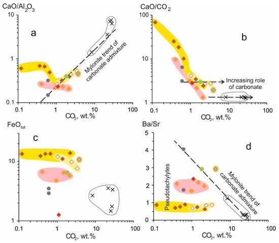 Correlation between CaO/Al2O3 and CO2 (Figure 8a) emphasizes a sufficient role of a carbonate mineral phase in the carbonate-aluminosilicate group and its decreasing in the aluminosilicate one. Common trends of mylonites on CaO/Al2O3-CO2, CaO/CO2-CO2, and Ba/Sr-CO2 diagrams (Figure 8a,b,d) indicate a mechanical mixing of an aluminosilicate material (with low CaO content and high Ba/Sr ratio) and a carbonate one (with high CaO content and low Ba/Sr ratio). A deviation from the mixing trend of a single data point of mylonite KL-10 indicates an admixture of magmatic material processed into mylonites. All pseudotachylytes definitely deviate from the mylonite trend of carbonate admixture and incorporate variable proportions of carbonate phase.